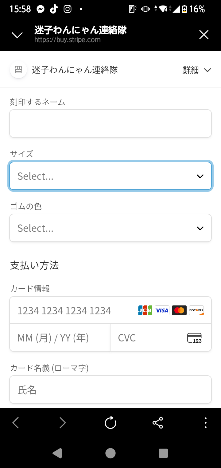 自動返信がLINEに届きますので、決済URLをタップし、迷子札のサイズを選び、レーザー刻印する内容を入力⇒決済